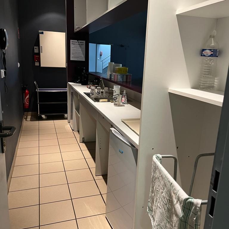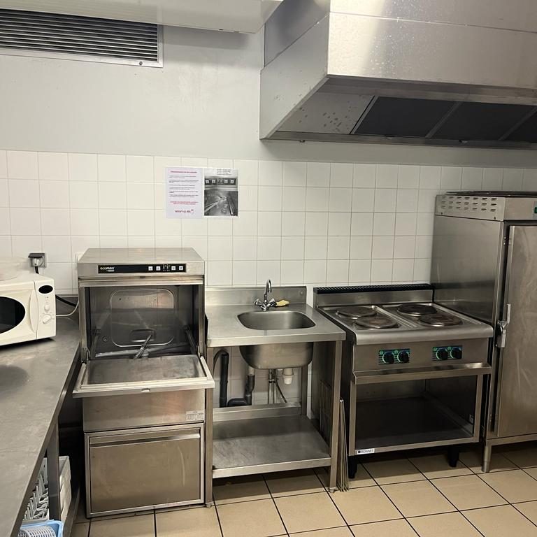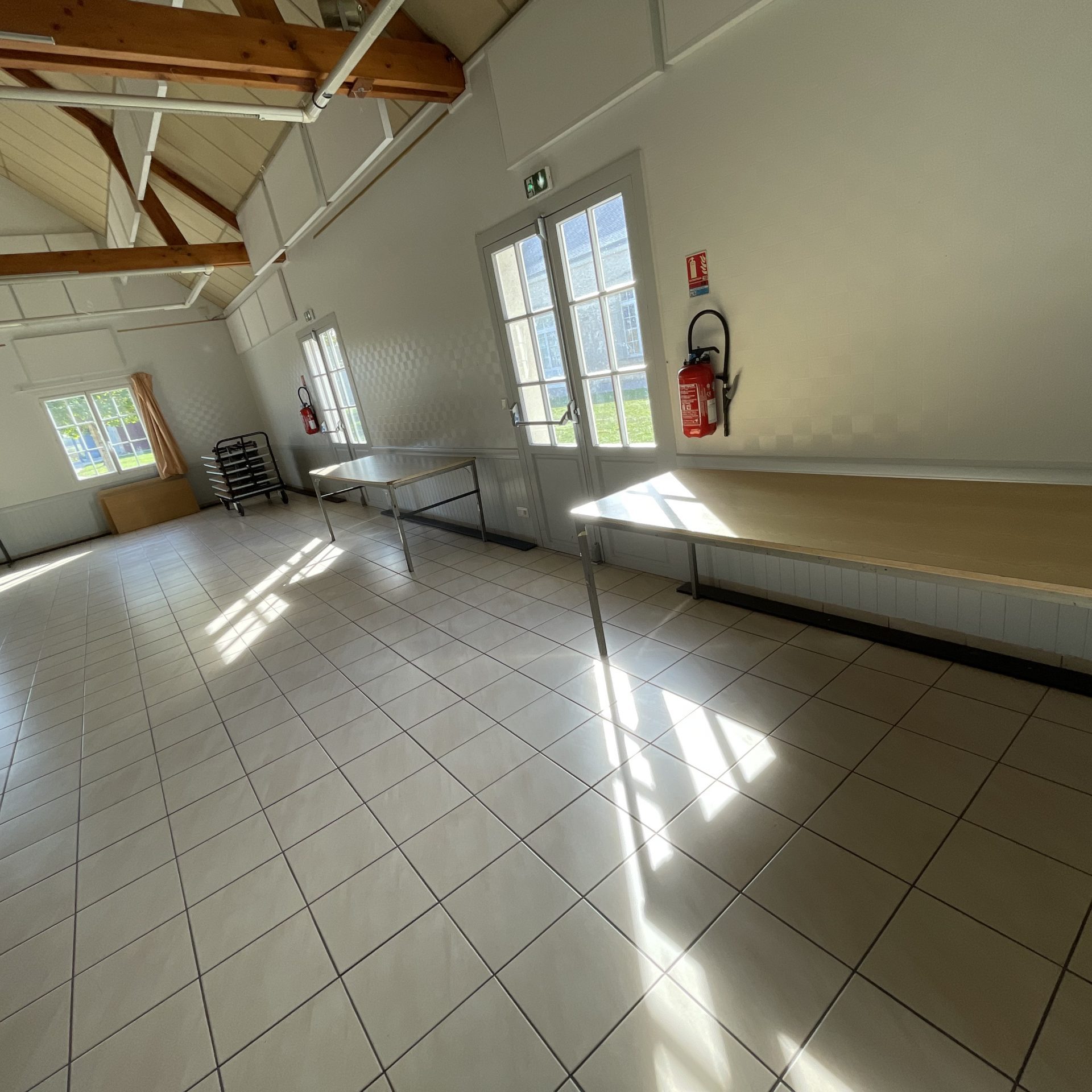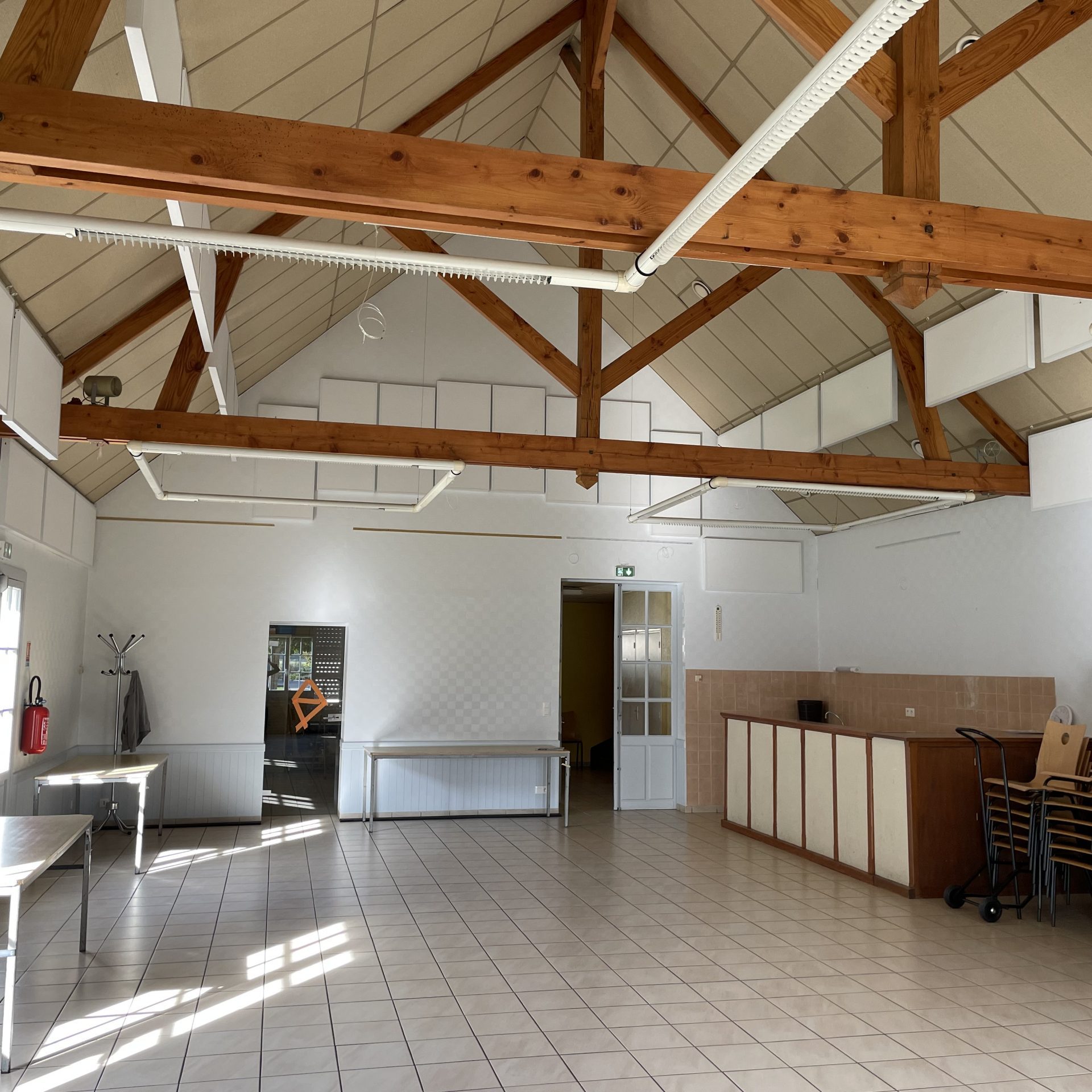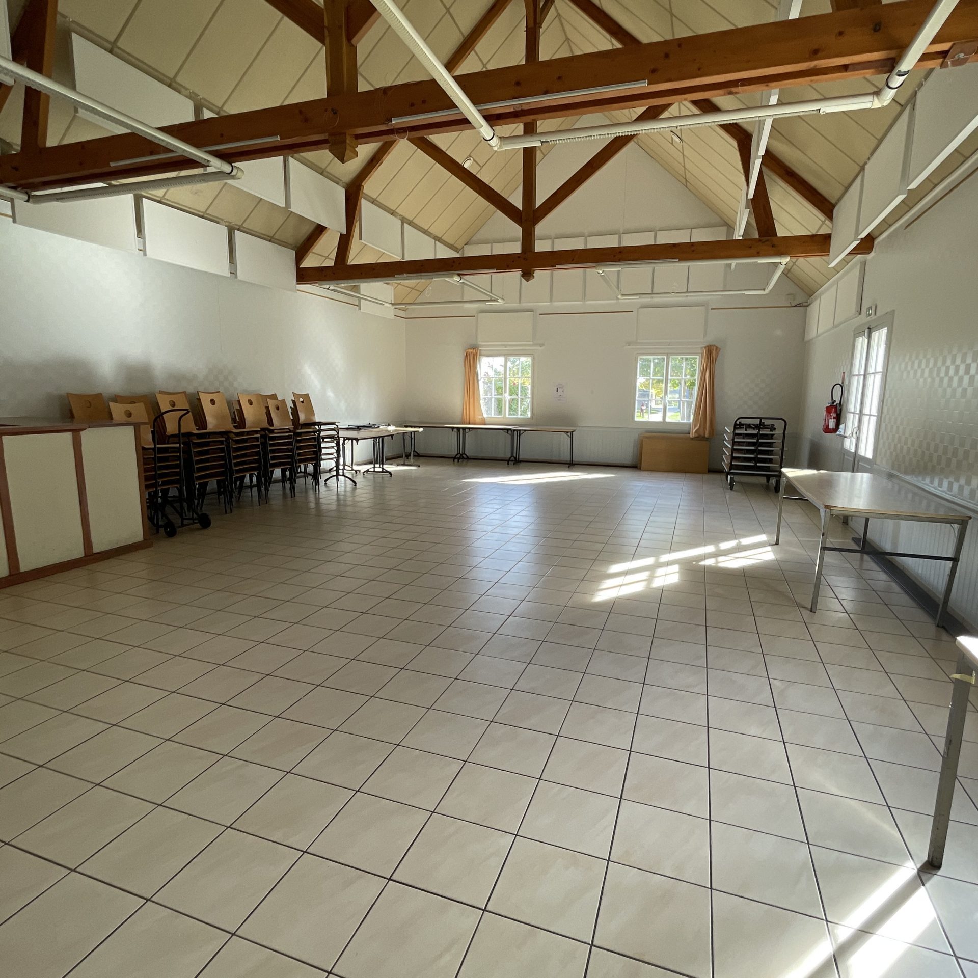 Matériel disponible : tables, chaises, petit réfrigérateur et cuisinière.